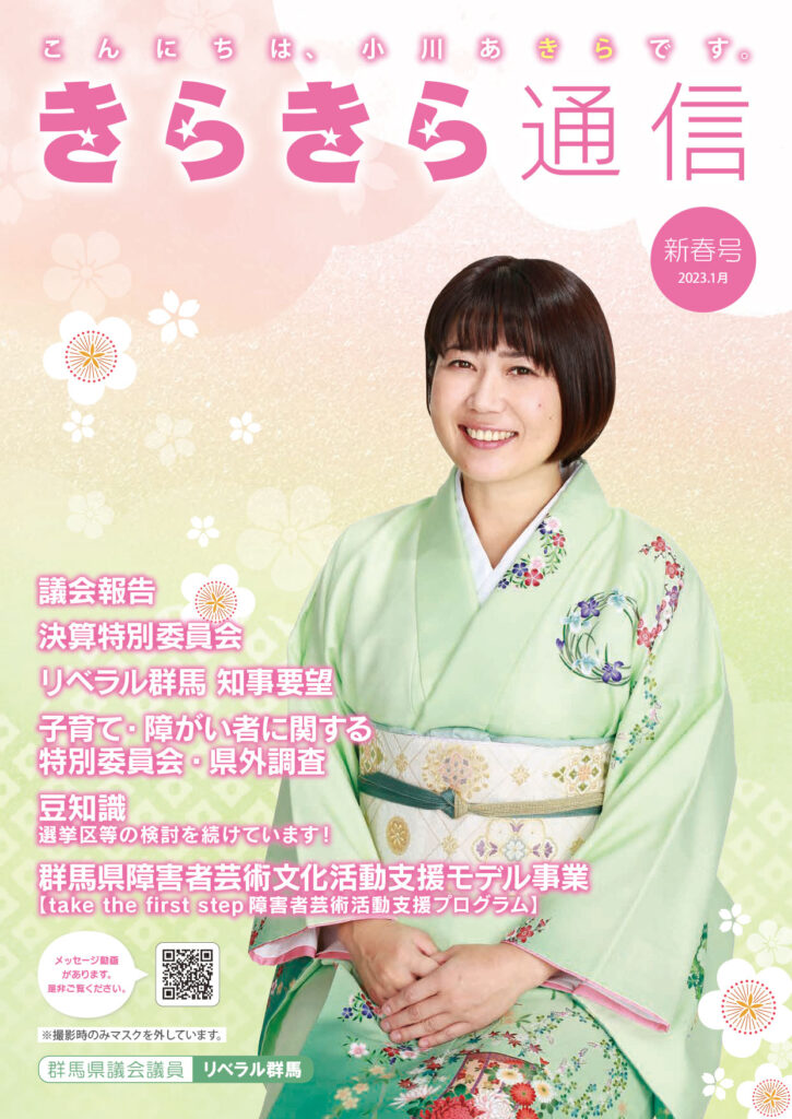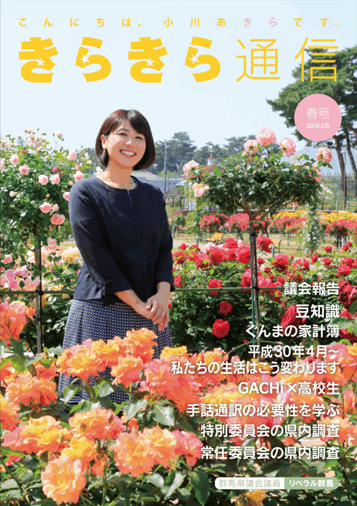 2011年、28歳で群馬県議会議員選挙に初当選し、4期(12年)を務めますが、議員時代は「きらきら通信」と称した会報を発行し、笑顔の着物姿やサイクリング写真で親しみやすいイメージを県民に広めます。
